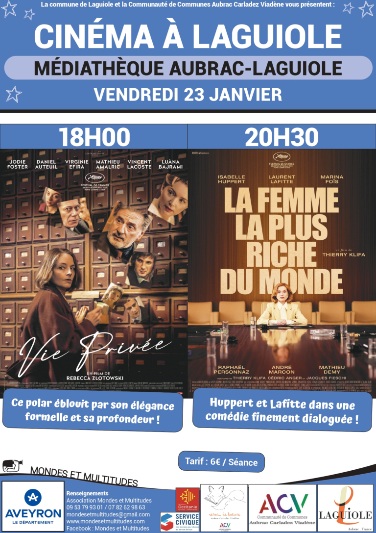 Prochaines séances à la médiathèque Aubrac-Laguiole vendredi 23 janvier 18h : Vie privée 20h30 : La femme la plus riche du monde Tarif d’une séance : 6€. Venez nombreux ! La Municipalité de Laguiole avec Mondes et Multitudes, CC Aubrac Carladez Viadène, et les bénévoles organisateurs ! En savoir plus : www.mondesetmultitudes.com