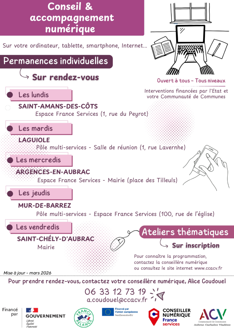 Madame Alice Coudouel, conseillère numérique de la Communauté de communes Aubrac Carladez Viadène (CCACV), tiendra des permanences individuelles à Laguiole tous les mardis, au Pôle multi-services (1, rue de Lavernhe – Salle de réunion).